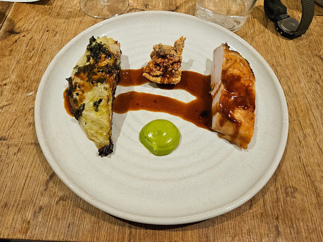 Onto the meat course, and a chicken breast and lightly crumbed piece of chicken thigh were served with a piece of charred hispi cabbage topped with a wild garlic salsa verde, a glossy chicken sauce and a blob of punchy wild garlic mayo. However, I must admit that I struggle to get excited about chicken breast, even when it’s cooked as well as this.
